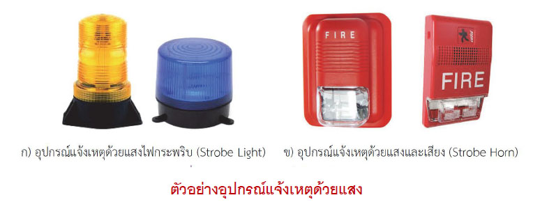 ข้อมูลทั่วไป: อุปกรณ์แจ้งเหตุด้วยแสง เป็นอุปกรณ์แจ้งเหตุด้วยแสงกระพริบที่มีความสว่างเพียงพอ สถานที่ที่จาเป็นต้องใช้อุปกรณ์นี้คือบริเวณที่มีเสียงรบกวนดังมากเกินกว่า 95 เดซิเบล (ซึ่งอาจใช้ร่วมกับอุปกรณ์แจ้งเหตุด้วยเสียง) และบริเวณที่ใช้เสียงอาจทาให้เกิดปัญหา เช่น ห้องผู้ป่วยในสถาน