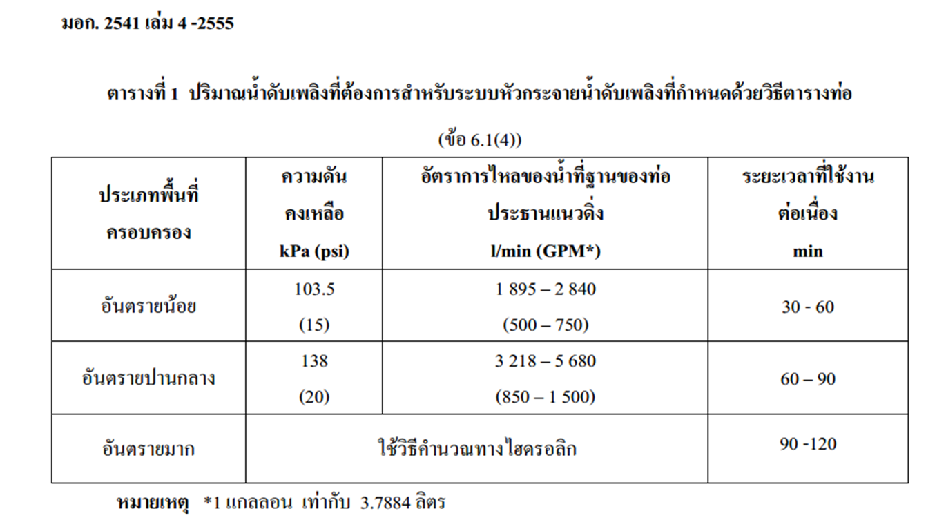 GMP (อัตราการไหลของปั๊มน้ำดับเพลิง) x 3.785 (ค่าหน่วยแกลลอนแปลงเป็นหน่วยลิตร) x 30 (ระยะเวลาหน่วยเป็นนาที) = ปริมาณน้ำสำรองดับเพลิงไหม้